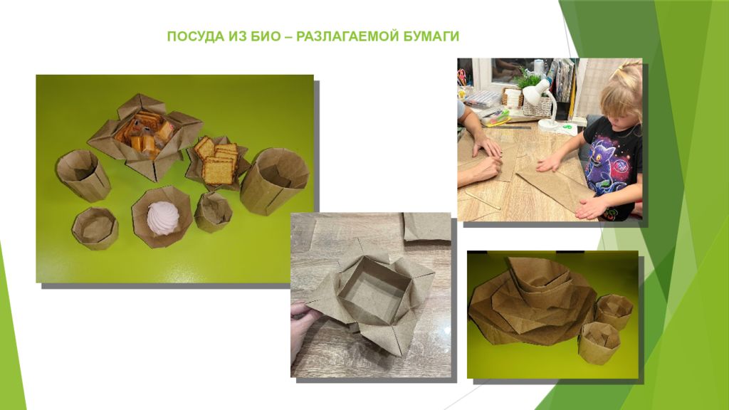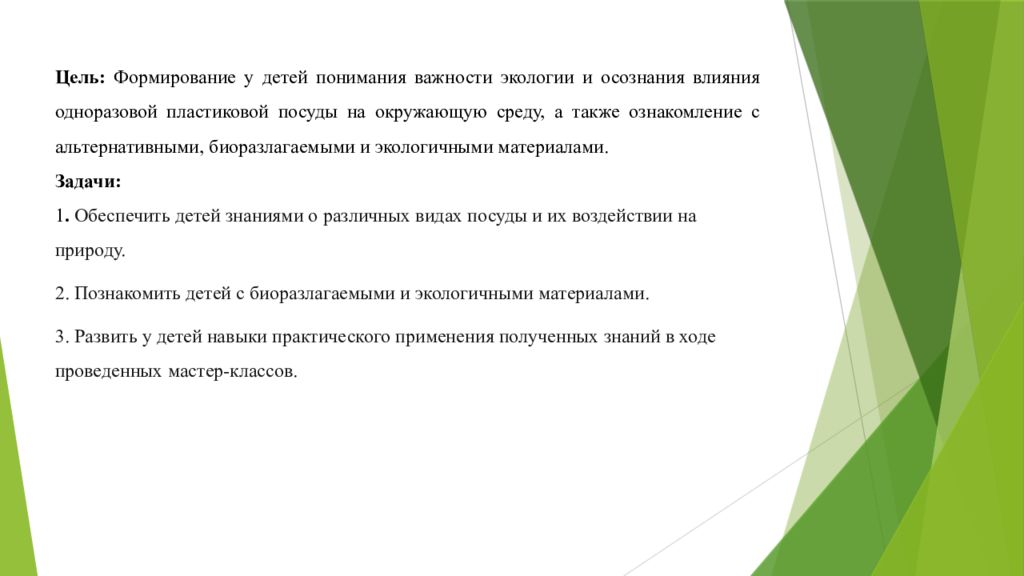 Цель: Формирование у детей понимания важности экологии и осознания влияния одноразовой пластиковой посуды на окружающую среду, а также ознакомление с альтернативными, биоразлагаемыми и экологичными материалами. Задачи: 1. Обеспечить детей знаниями о различных видах посуды и их воздействии на природу. 2. Познакомить детей с биоразлагаемыми и экологичными материалами. 3. Развить у детей навыки практического применения полученных знаний в ходе проведенных мастер-классов.