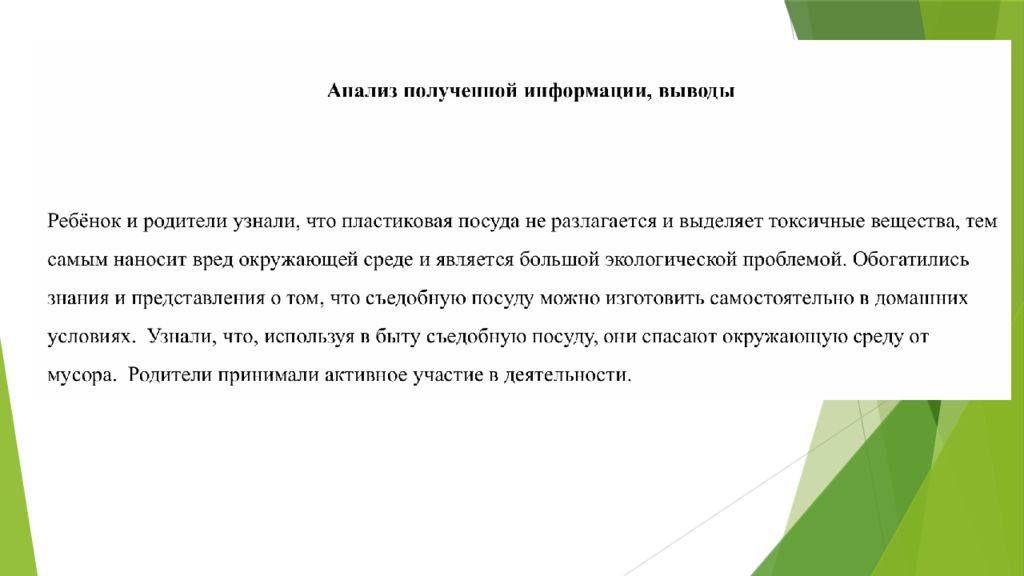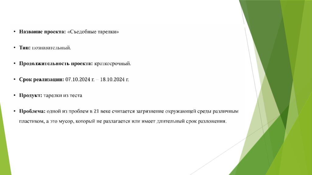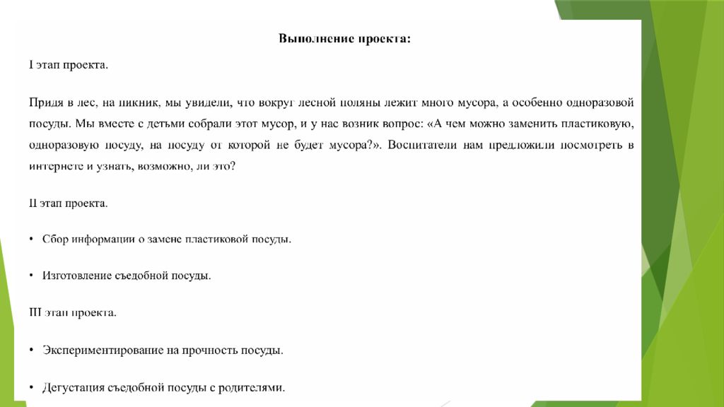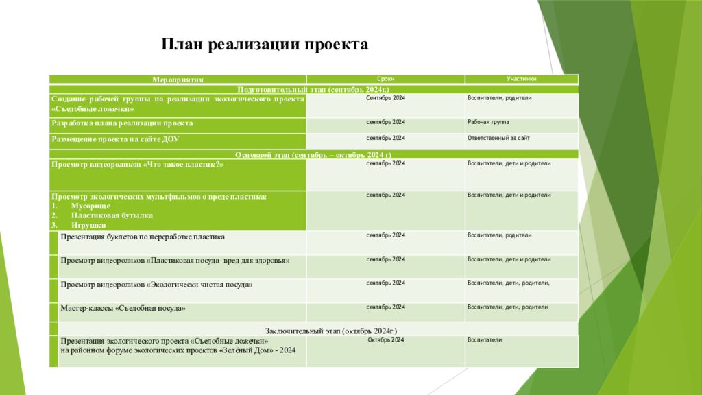 Мероприятия Сроки Участники Подготовительный этап (сентябрь 2024г.) Создание рабочей группы по реализации экологического проекта «Съедобные ложечки» Сентябрь 2024 Воспитатели, родители Разработка плана реализации проекта сентябрь 2024 Рабочая группа Размещение проекта на сайте ДОУ сентябрь 2024 Ответственный за сайт Основной этап (сентябрь – октябрь 2024 г) Просмотр видеороликов «Что такое пластик?» сентябрь 2024 Воспитатели, дети и родители Просмотр экологических мультфильмов о вреде пластика: Мусорище Пластиковая бутылка Игрушки сентябрь 2024 Воспитатели, дети и родители Презентация буклетов по переработке пластика сентябрь 2024 Воспитатели, родители Просмотр видеороликов «Пластиковая посуда- вред для здоровья» сентябрь 2024 Воспитатели, дети и родители Просмотр видеороликов «Экологически чистая посуда» сентябрь 2024 Воспитатели, дети, родители, Мастер-классы «Съедобная посуда» сентябрь 2024 Воспитатели, дети, родители Заключительный этап (октябрь 2024г.) Презентация экологического проекта «Съедобные ложечки» на районном форуме экологических проектов «Зелёный Дом» - 2024 Октябрь 2024 Воспитатели План реализации проекта