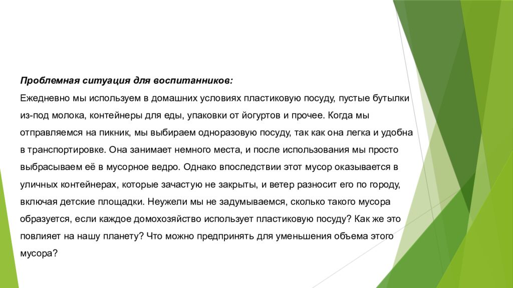 Проблемная ситуация для воспитанников: Ежедневно мы используем в домашних условиях пластиковую посуду, пустые бутылки из-под молока, контейнеры для еды, упаковки от йогуртов и прочее. Когда мы отправляемся на пикник, мы выбираем одноразовую посуду, так как она легка и удобна в транспортировке. Она занимает немного места, и после использования мы просто выбрасываем её в мусорное ведро. Однако впоследствии этот мусор оказывается в уличных контейнерах, которые зачастую не закрыты, и ветер разносит его по городу, включая детские площадки. Неужели мы не задумываемся, сколько такого мусора образуется, если каждое домохозяйство использует пластиковую посуду? Как же это повлияет на нашу планету? Что можно предпринять для уменьшения объема этого мусора?