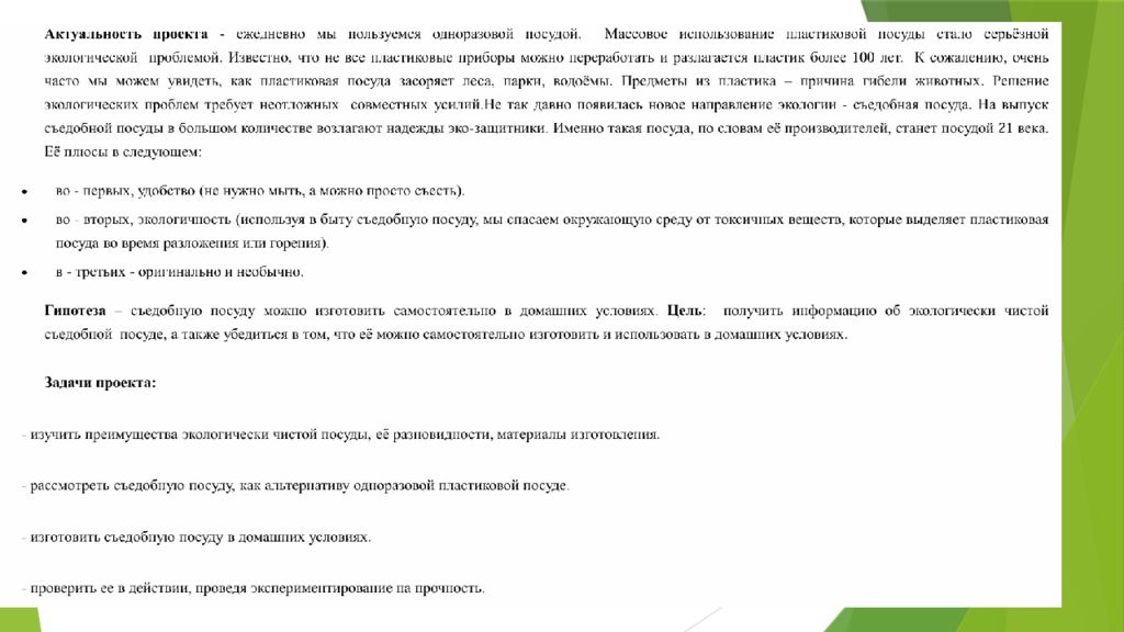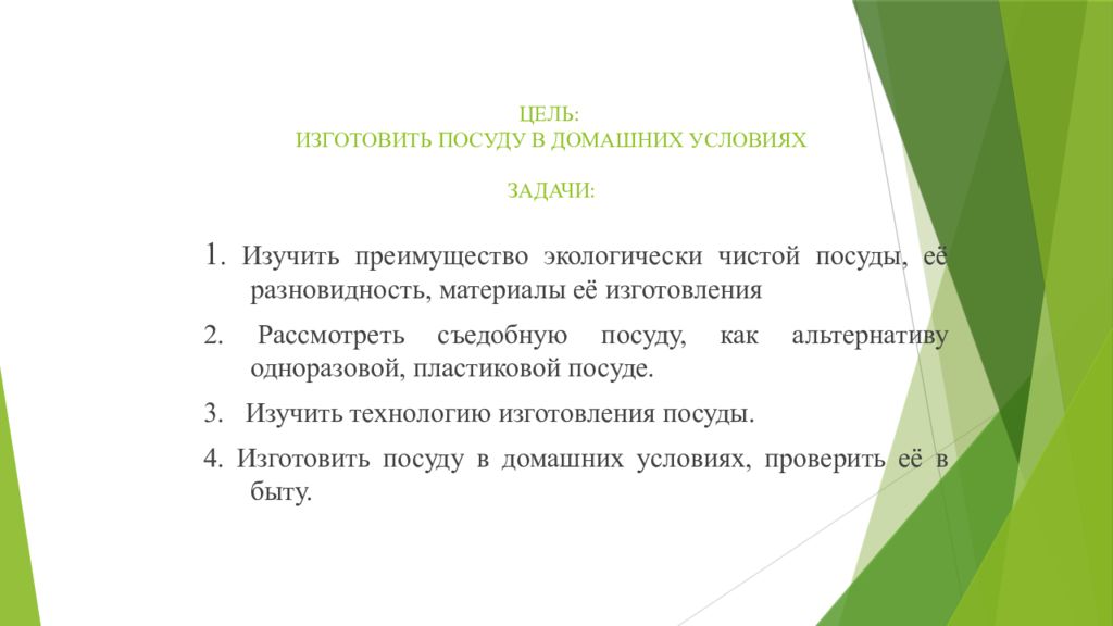 1. Изучить преимущество экологически чистой посуды, её разновидность, материалы её изготовления 2. Рассмотреть съедобную посуду, как альтернативу одноразовой, пластиковой посуде. 3. Изучить технологию изготовления посуды. 4. Изготовить посуду в домашних условиях, проверить её в быту.