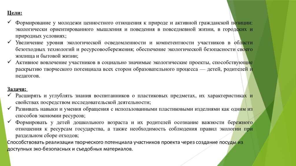 Цели: Формирование у молодежи ценностного отношения к природе и активной гражданской позиции: экологически ориентированного мышления и поведения в повседневной жизни, в городских и природных условиях; Увеличение уровня экологической осведомленности и компетентности участников в области безотходных технологий и ресурсовосбережения ; обеспечение экологической безопасности своего жилища и бытовой жизни; Активное вовлечение участников в социально значимые экологические проекты, способствующие раскрытию творческого потенциала всех сторон образовательного процесса — детей, родителей и педагогов. Задачи: Расширять и углублять знания воспитанников о пластиковых предметах, их характеристиках и свойствах посредством исследовательской деятельности; Развивать навыки и умения обращения с использованными пластиковыми изделиями как одним из способов экономии ресурсов; Формировать у детей дошкольного возраста и их родителей осознание важности бережного отношения к ресурсам государства, а также необходимость соблюдения правил экологии при раздельном сборе отходов; Способствовать реализации творческого потенциала участников проекта через создание посуды из доступных эко-безопасных и съедобных материалов.