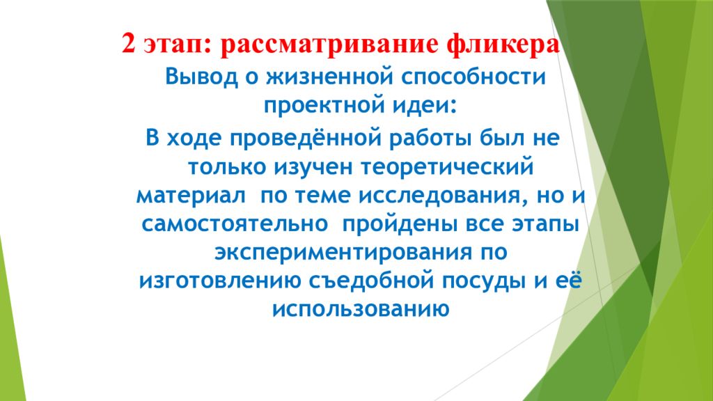 Вывод о жизненной способности проектной идеи: В ходе проведённой работы был не только изучен теоретический материал по теме исследования, но и самостоятельно пройдены все этапы экспериментирования по изготовлению съедобной посуды и её использованию