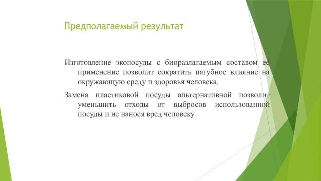 Изготовление экопосуды с биоразлагаемым составом её применение позволит сократить пагубное влияние на окружающую среду и здоровья человека. Замена пластиковой посуды альтернативной позволит уменьшить отходы от выбросов использованной посуды и не нанося вред человеку