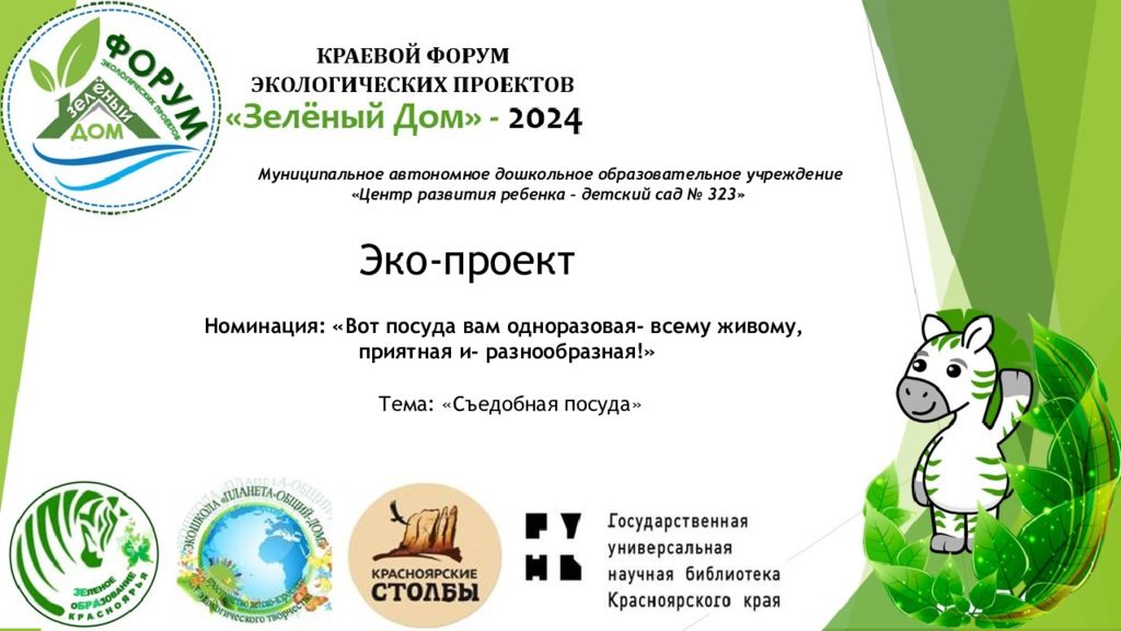 Муниципальное автономное дошкольное образовательное учреждение «Центр развития ребенка – детский сад № 323» Эко-проект Номинация: «Вот посуда вам одноразовая- всему живому, приятная и- разнообразная!» Тема: «Съедобная посуда»