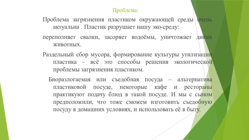 Проблема загрязнения пластиком окружающей среды очень актуальна. Пластик разрушает нашу эко-среду: переполняет свалки, засоряет водоёмы, уничтожает диких животных. Раздельный сбор мусора, формирование культуры утилизации пластика – всё это способы решения экологической проблемы загрязнения пластиком. Биоразлогаемая или съедобная посуда – альтернатива пластиковой посуде, некоторые кафе и рестораны практикуют подачу блюд в такой посуде. И мы с сыном предположили, что тоже сможем изготовить съедобную посуду в домашних условиях, и использовать её в быту.