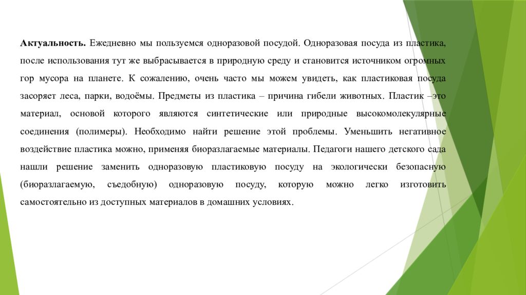Актуальность. Ежедневно мы пользуемся одноразовой посудой. Одноразовая посуда из пластика, после использования тут же выбрасывается в природную среду и становится источником огромных гор мусора на планете. К сожалению, очень часто мы можем увидеть, как пластиковая посуда засоряет леса, парки, водоёмы. Предметы из пластика – причина гибели животных. Пластик –это материал, основой которого являются синтетические или природные высокомолекулярные соединения (полимеры). Необходимо найти решение этой проблемы. Уменьшить негативное воздействие пластика можно, применяя биоразлагаемые материалы. Педагоги нашего детского сада нашли решение заменить одноразовую пластиковую посуду на экологически безопасную ( биоразлагаемую, съедобную) одноразовую посуду, которую можно легко изготовить самостоятельно из доступных материалов в домашних условиях.