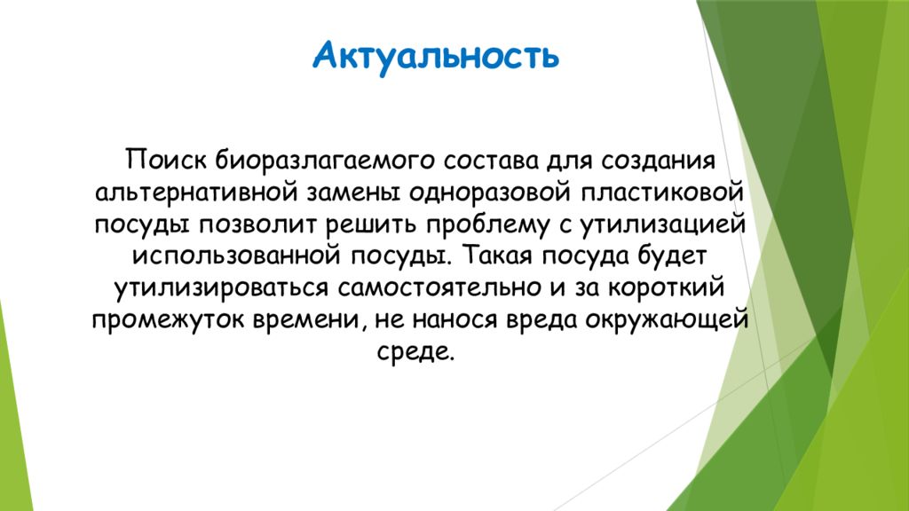 Актуальность Поиск биоразлагаемого состава для создания альтернативной замены одноразовой пластиковой посуды позволит решить проблему с утилизацией использованной посуды. Такая посуда будет утилизироваться самостоятельно и за короткий промежуток времени, не нанося вреда окружающей среде.