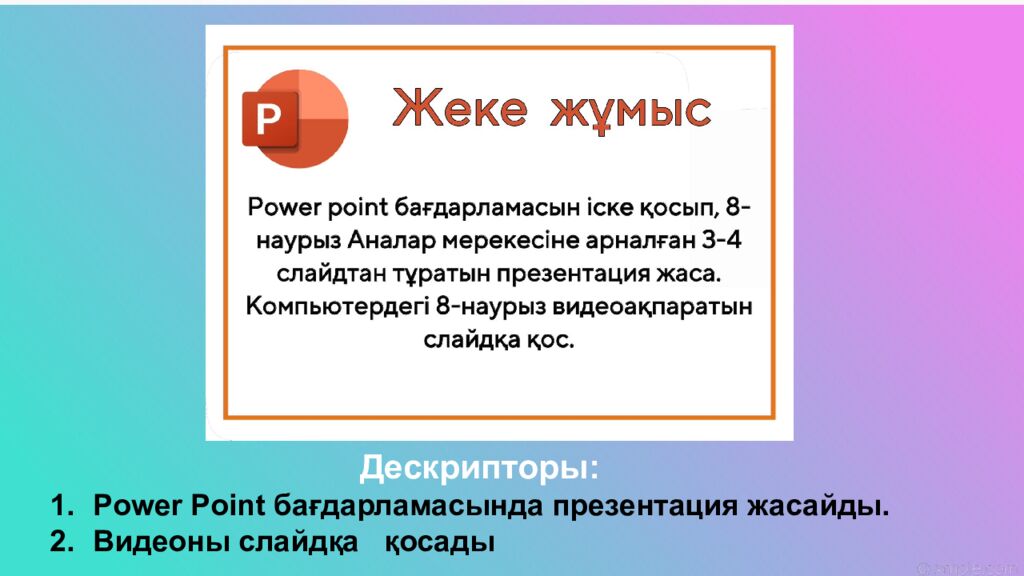 Мәтіннен тұрмыстық химия тауарларының қасиеттерін сипаттайтын ұғымдардың астын сыз. Мәтінді оқы.Мәтінге сәйкес, дұрыс жауап нұсқасын таңда. Мәтінді оқы. Тұжырымдардың қайсысы мәтінге сәйкес келеді? Дескрипторы: Power Point бағдарламасында презентация жасайды. Видеоны слайдқа қосады