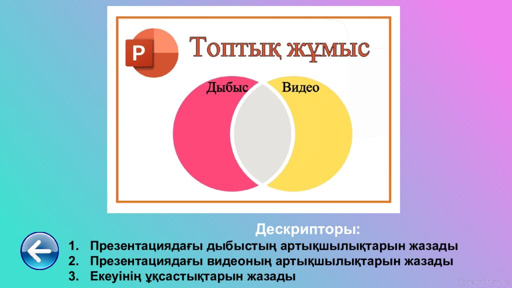 Мәтіннен тұрмыстық химия тауарларының қасиеттерін сипаттайтын ұғымдардың астын сыз. Мәтінді оқы.Мәтінге сәйкес, дұрыс жауап нұсқасын таңда. Мәтінді оқы. Тұжырымдардың қайсысы мәтінге сәйкес келеді? Дескрипторы: Презентациядағы дыбыстың артықшылықтарын жазады Презентациядағы видеоның артықшылықтарын жазады Екеуінің ұқсастықтарын жазады