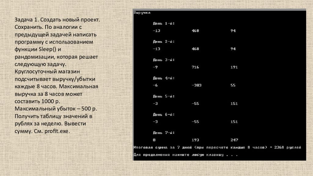 Задача 1. Создать новый проект. Сохранить. По аналогии с предыдущей задачей написать программу с использованием функции Sleep() и рандомизации, которая решает следующую задачу. Круглосуточный магазин подсчитывает выручку / убытки каждые 8 часов. Максимальная выручка за 8 часов может составить 1000 р. Максимальный убыток – 500 р. Получить таблицу значений в рублях за неделю. Вывести сумму. См. profit.exe.