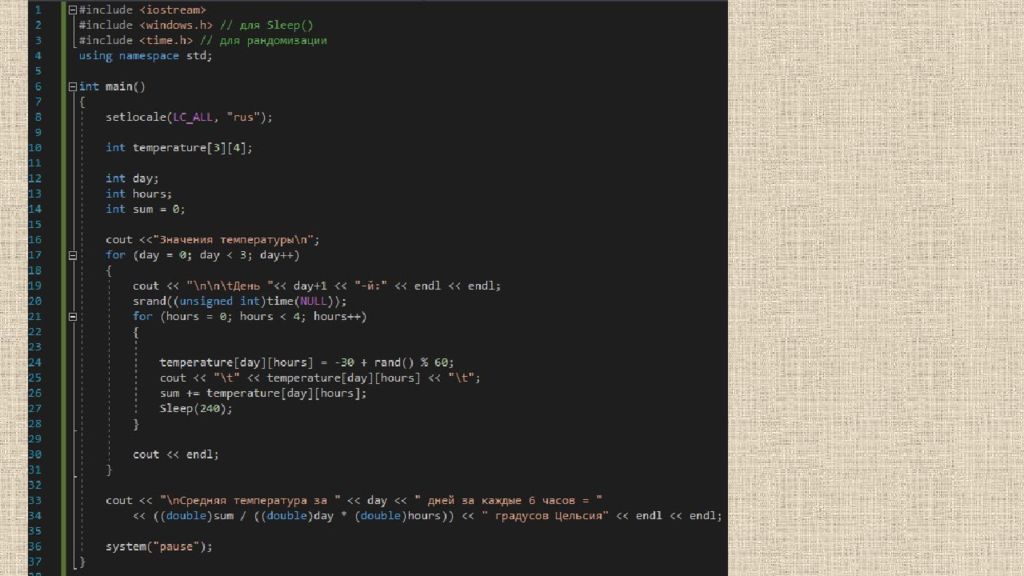 Задача. Написать программу, которая, используя функцию рандомизации, выводит значения температуры за каждые 6 часов за 3 дня и подсчитывает среднее арифметическое значение температуры за всё время. Температуру задать от -30 до +30. См. в \\simba\001 файл temperature.exe. Генерация "случайных" чисел и функция Sleep()