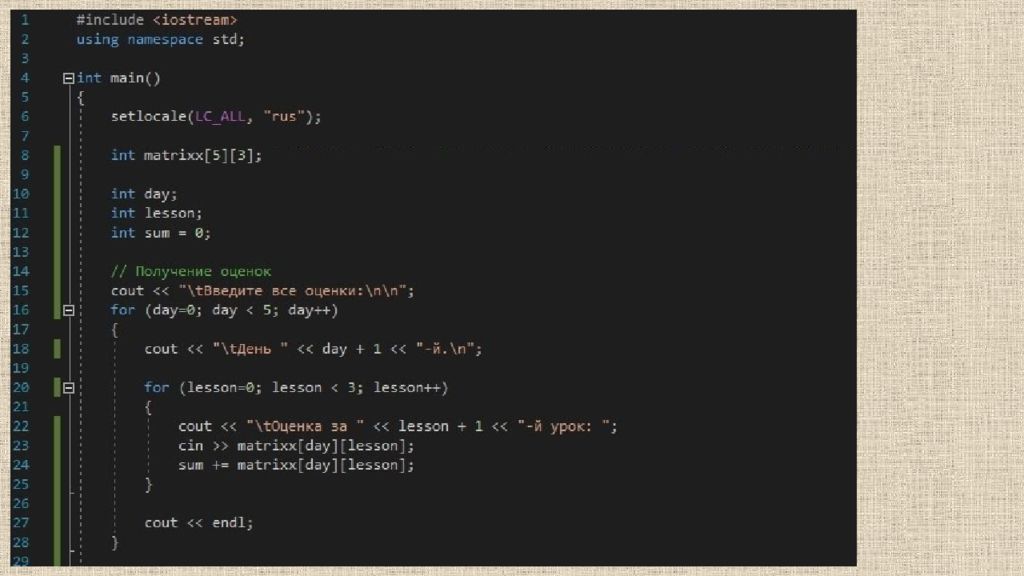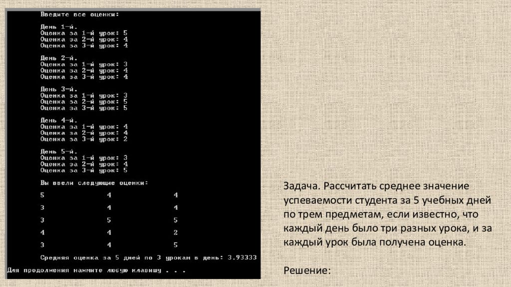Задача. Рассчитать среднее значение успеваемости студента за 5 учебных дней по трем предметам, если известно, что каждый день было три разных урока, и за каждый урок была получена оценка. Решение: