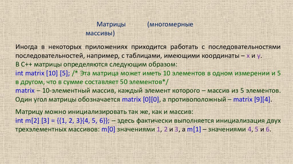 Матрицы (многомерные массивы) Иногда в некоторых приложениях приходится работать с последовательностями последовательностей, например, с таблицами, имеющими координаты – x и y. В C++ матрицы определяются следующим образом: int matrix [10] [5]; / * Эта матрица может иметь 10 элементов в одном измерении и 5 в другом, что в сумме составляет 50 элементов* / matrix – 10- элементный массив, каждый элемент которого – массив из 5 элементов. Один угол матрицы обозначается matrix [0][0], а противоположный – matrix [9][4]. Матрицу можно инициализировать так же, как и массив: int m[2] [3] = {{1, 2, 3}{4, 5, 6 }}; – здесь фактически выполняется инициализация двух трехэлементных массивов: m[0] значениями 1, 2 и 3, а m[1] – значениями 4, 5 и 6.