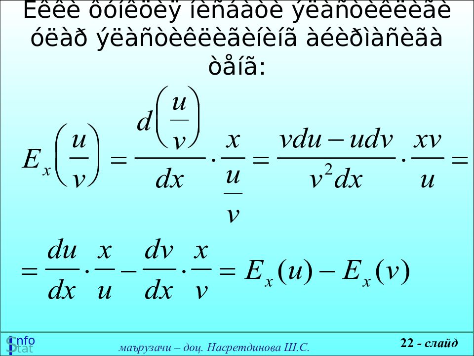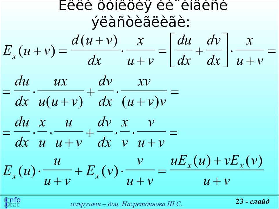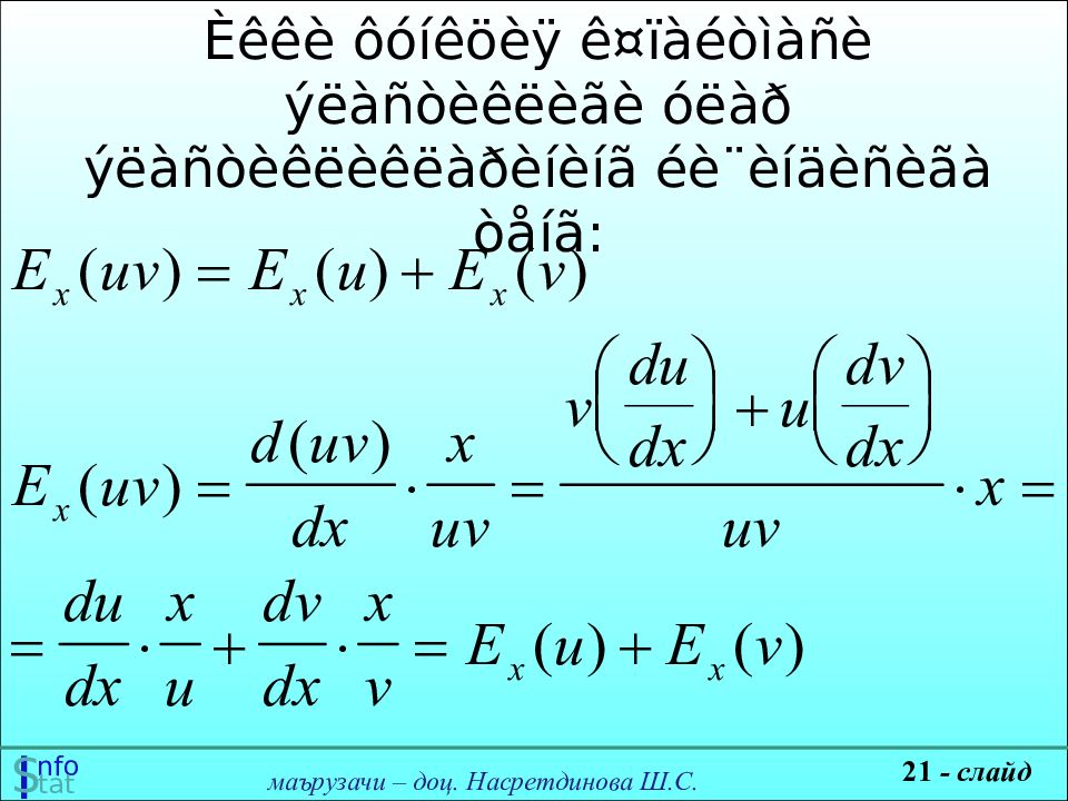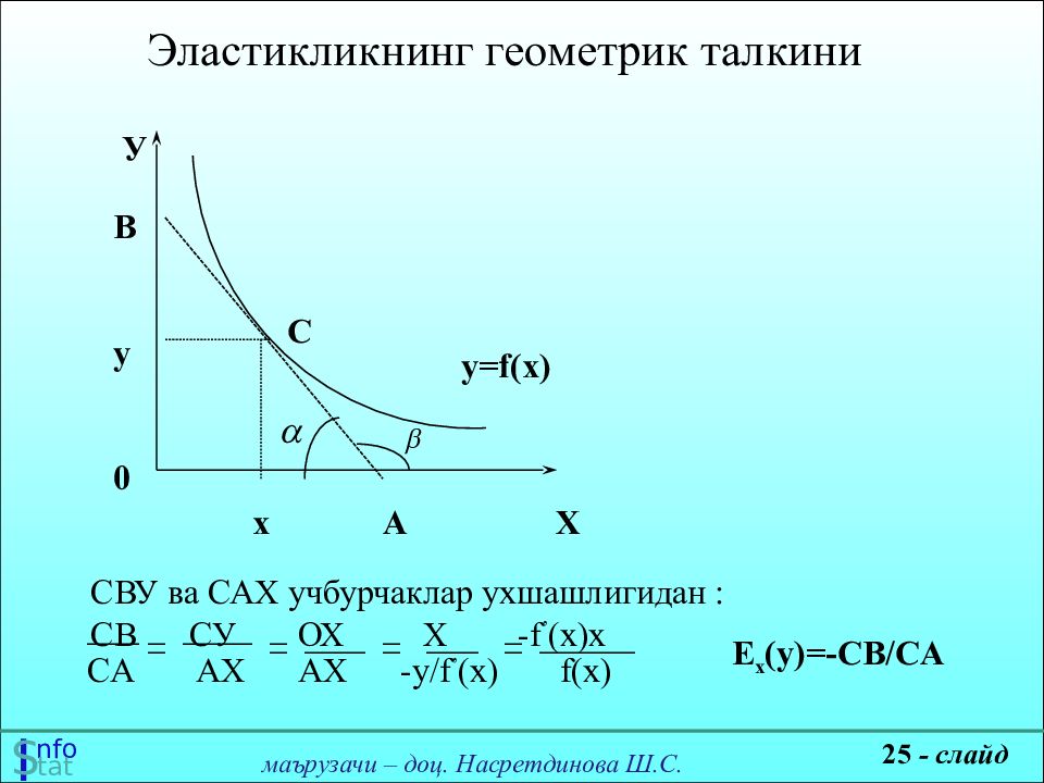 Эластикликнинг геометрик талкини У В у 0 х А Х С y=f(x) СВУ ва САХ учбурчаклар ухшашлигидан : СВ СУ ОХ Х -f ’ (x)x CА АХ АХ -y/f ’ (x) f(x) E x (y)=-CB/CA