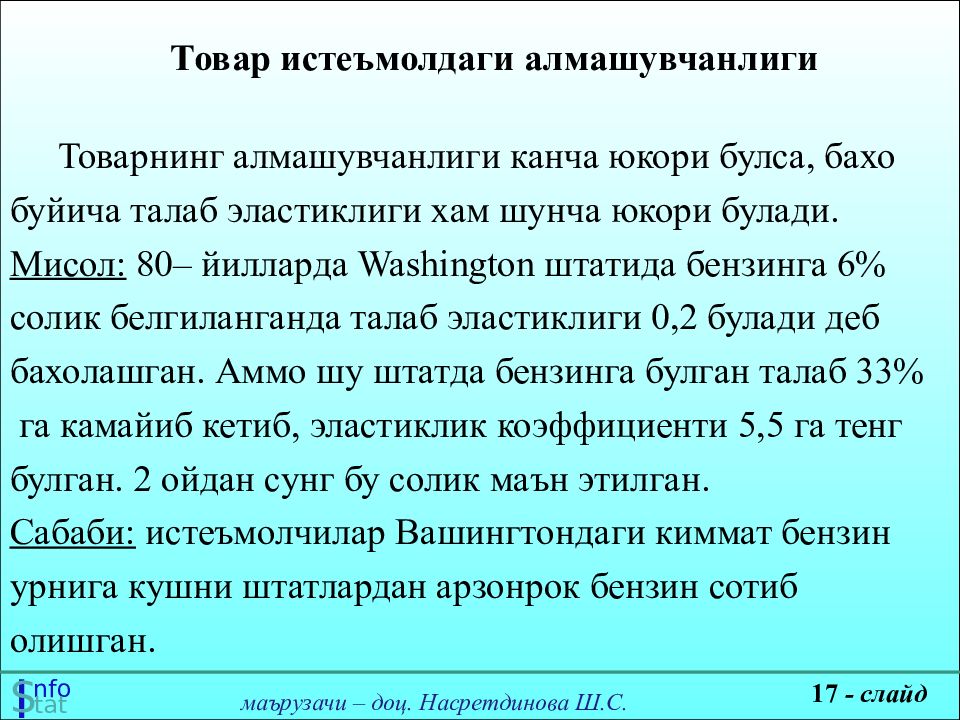 Товар истеъмолдаги алмашувчанлиги Товарнинг алмашувчанлиги канча юкори булса, бахо буйича талаб эластиклиги хам шунча юкори булади. Мисол: 80– йилларда Washington штатида бензинга 6% солик белгиланганда талаб эластиклиги 0,2 булади деб бахолашган. Аммо шу штатда бензинга булган талаб 33% га камайиб кетиб, эластиклик коэффициенти 5,5 га тенг булган. 2 ойдан сунг бу солик маън этилган. Сабаби: истеъмолчилар Вашингтондаги киммат бензин урнига кушни штатлардан арзонрок бензин сотиб олишган.
