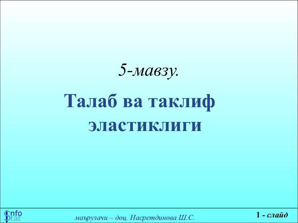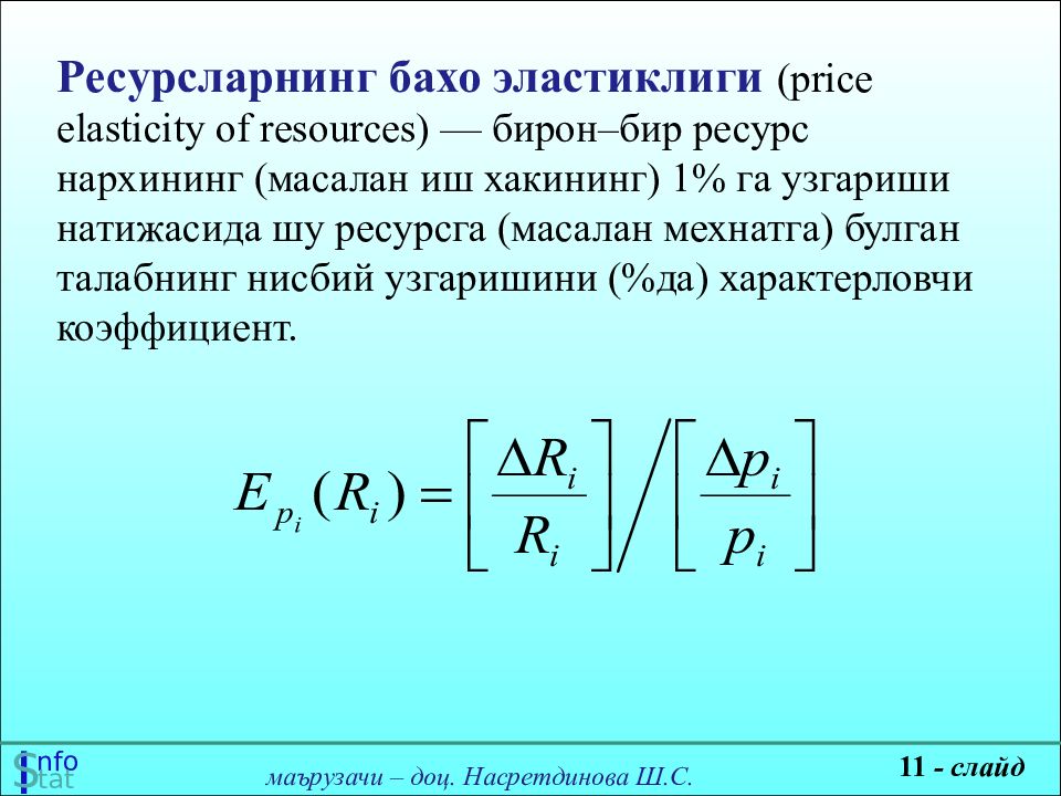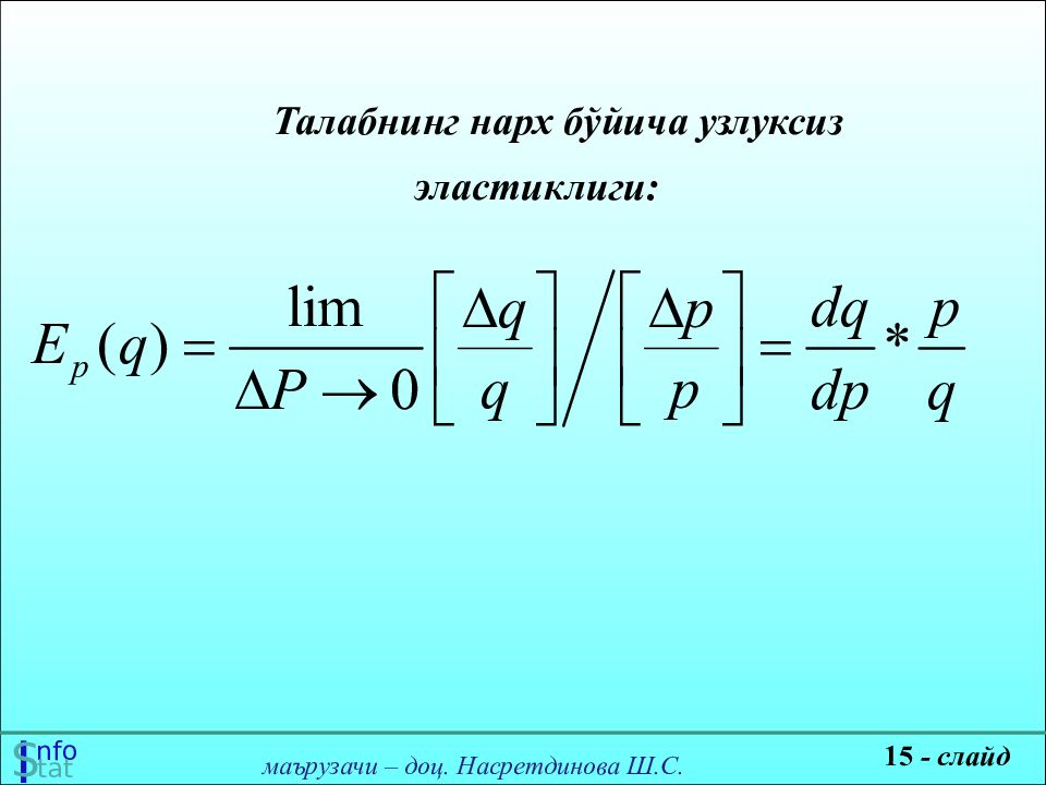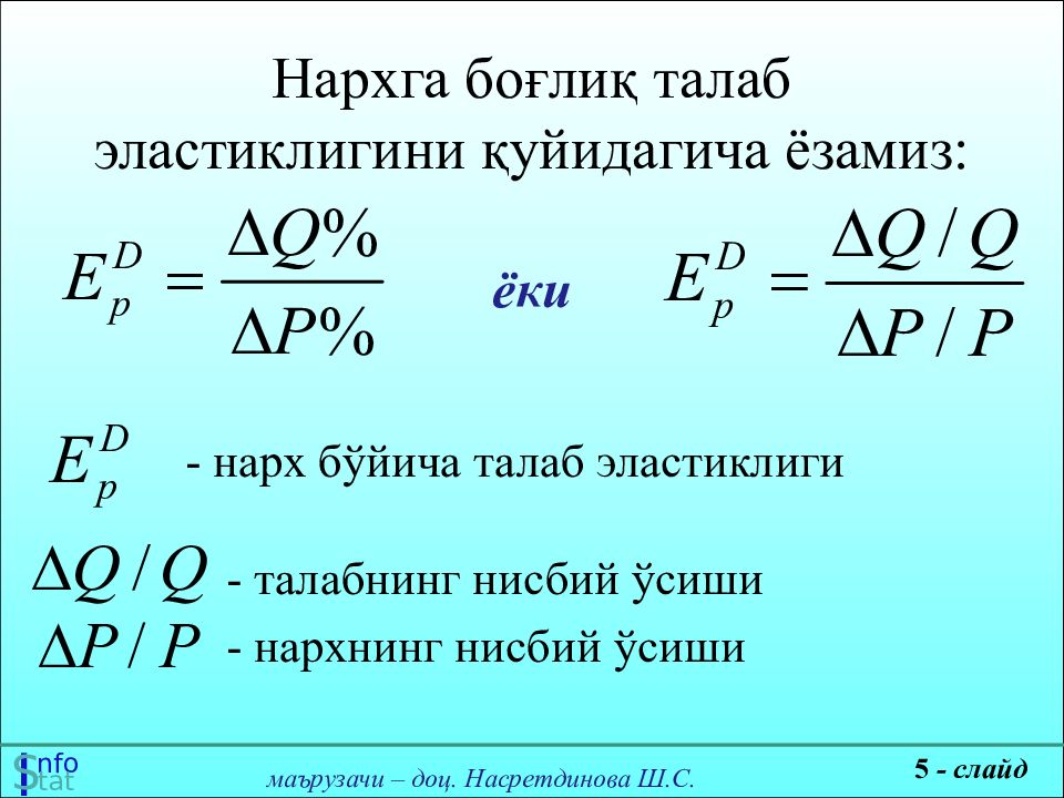 Слайд 5: Нархга боғлиқ талаб эластиклигини қуйидагича ёзамиз: