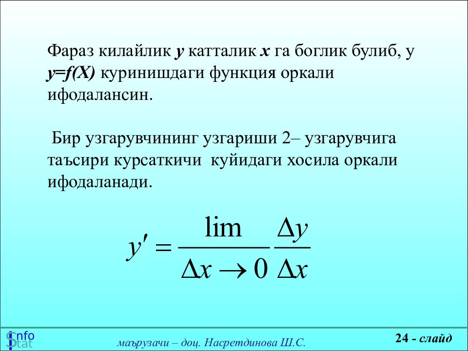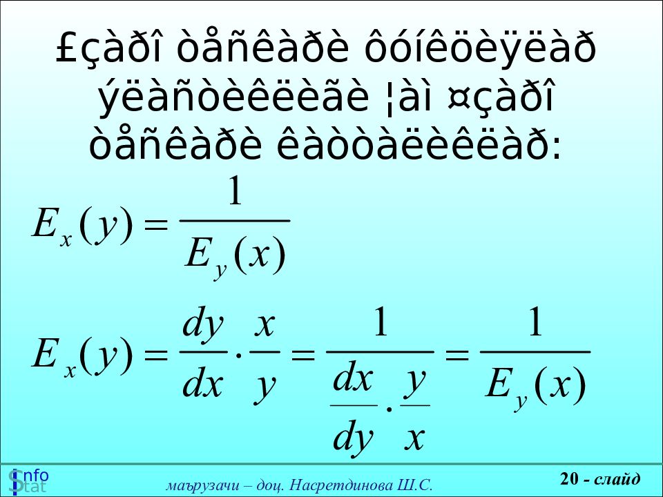 Фараз килайлик у катталик x га боглик булиб, у у=f(Х) куринишдаги функция оркали ифодалансин. Бир узгарувчининг узгариши 2– узгарувчига таъсири курсаткичи куйидаги хосила оркали ифодаланади.