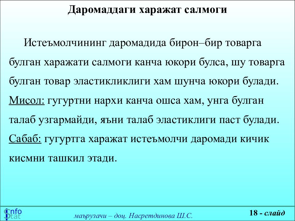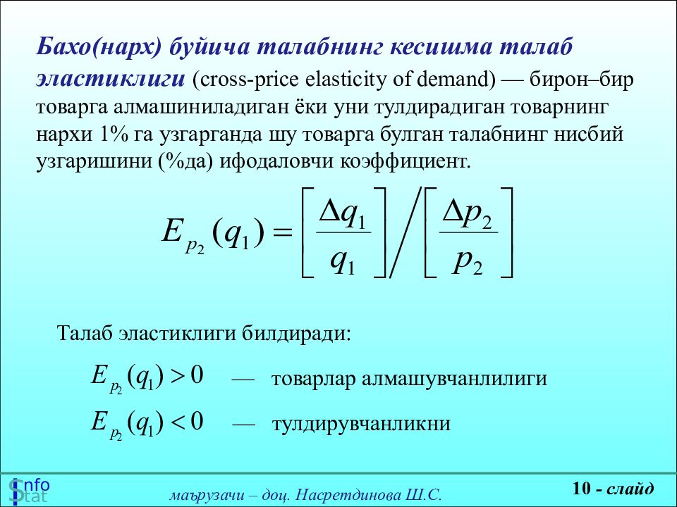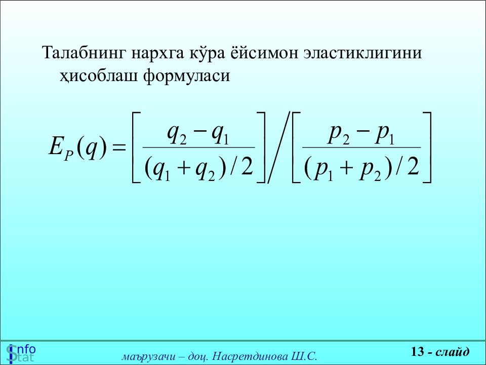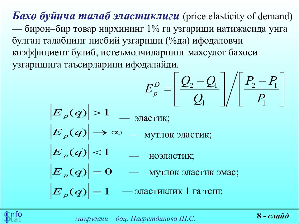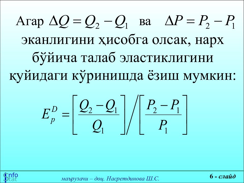 Слайд 6: эканлигини ҳисобга олсак, нарх бўйича талаб эластиклигини қуйидаги кўринишда ёзиш мумкин: