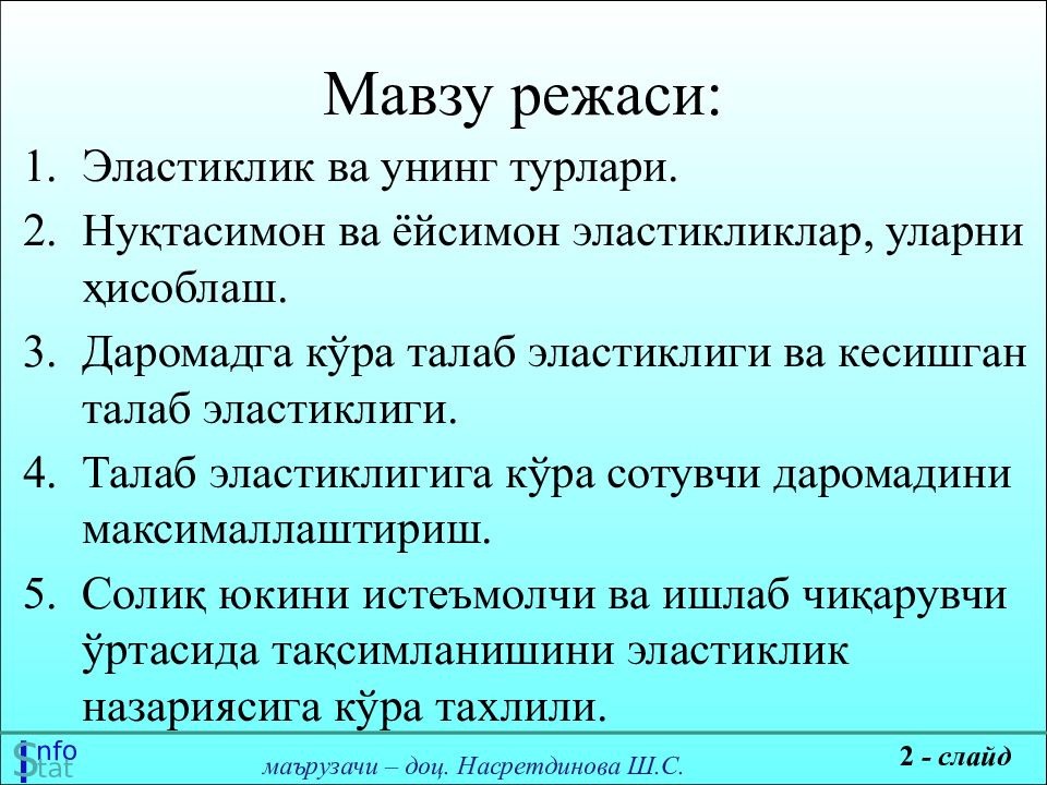 Эластиклик ва унинг турлари. Нуқтасимон ва ёйсимон эластиклик лар, уларни ҳисоблаш. Даромадга кўра талаб эластиклиги ва к есиш ган талаб эластикли ги. Талаб эластиклигига кўра сотувчи даромадини максималлаштириш. Солиқ юкини истеъмолчи ва ишлаб чиқарувчи ўртасида тақсимланишини эластиклик назариясига кўра тахлили.