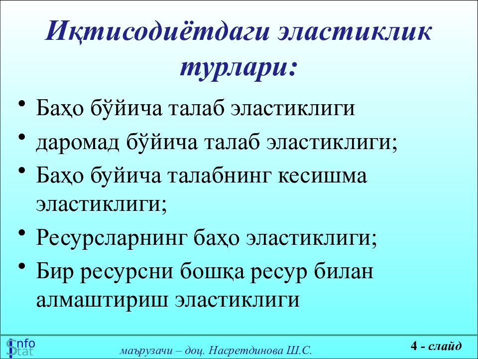 Слайд 4: Иқтисодиётдаги эластиклик турлари: