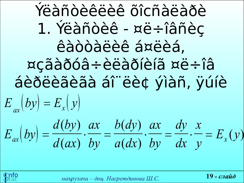 Слайд 19: Ýëàñòèêëèê õîcñàëàðè 1. Ýëàñòèê - ¤ë÷îâñèç êàòòàëèê á¤ëèá, ¤çãàðóâ÷èëàðíèíã ¤ë÷îâ áèðëèãèãà áî¨ëè¢ ýìàñ, ÿúíè