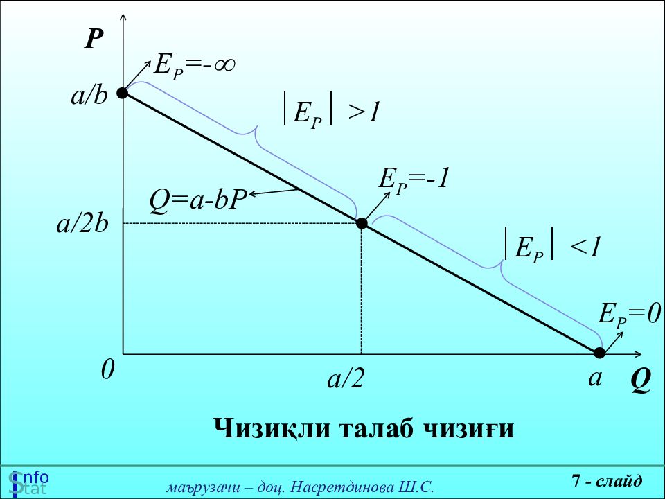 Q=a-bP E P =- E P =-1 E P =0 P a/b Q 0 a/2b a/2 a Чизиқли талаб чизиғи E P >1 E P <1