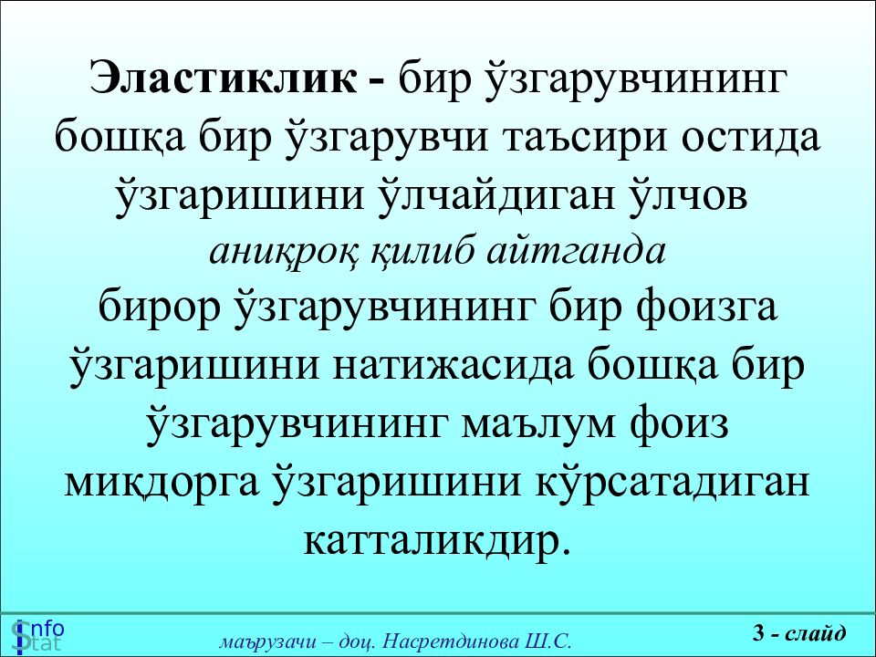 Слайд 3: Эластиклик - бир ўзгарувчининг бошқа бир ўзгарувчи таъсири остида ўзгаришини ўлчайдиган ўлчов аниқроқ қилиб айтганда бирор ўзгарувчининг бир фоизга ўзгаришини натижасида бошқа бир ўзгарувчининг маълум фоиз миқдорга ўзгаришини кўрсатадиган катталикдир