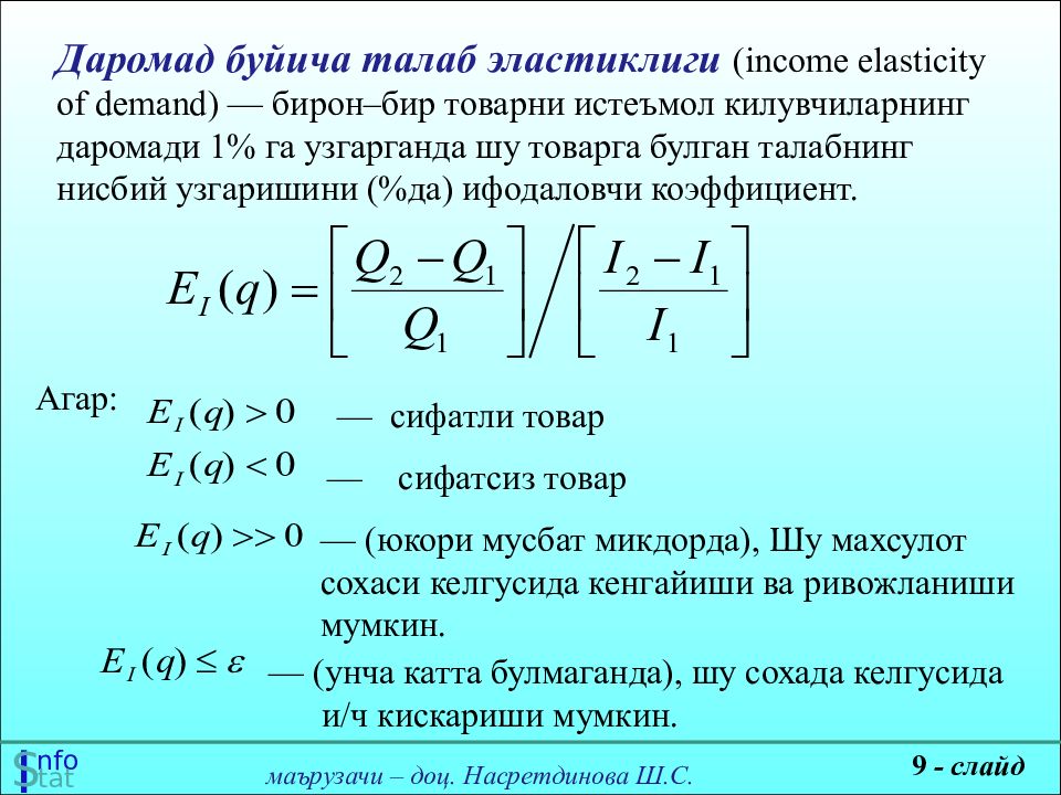 Даромад буйича талаб эластиклиги ( income elasticity of demand ) — бирон – бир товарни истеъмол килувчиларнинг даромади 1% га узгарганда шу товарга булган талабнинг нисбий узгаришини (%да) ифодаловчи коэффициент. — сифатли товар — сифатсиз товар — (юкори мусбат микдорда), Шу махсулот сохаси келгусида кенгайиши ва ривожланиши мумкин. — (унча катта булмаганда), шу сохада келгусида и/ч кискариши мумкин. Агар: