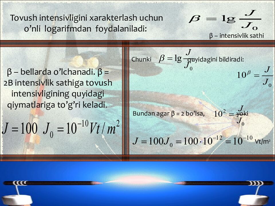 Tovush intensivligini xarakterlash uchun o’nli logarifmdan foydalaniladi: β – bellarda o’lchanadi. β = 2B intensivlik sathiga tovush intensivligining quyidagi qiymatlariga to’g’ri keladi. β – intensivlik sathi Chunki quyidagini bildiradi: Bundan agar β = 2 bo’lsa, yoki Vt/m 2