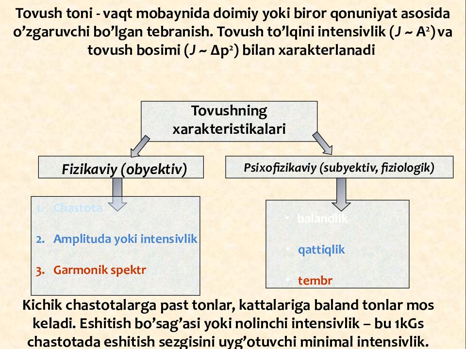 Tovush toni - vaqt mobaynida doimiy yoki biror qonuniyat asosida o’zgaruvchi bo’lgan tebranish. Tovush to’lqini intensivlik ( J ~ A 2 ) va tovush bosimi ( J ~ ∆p 2 ) bilan xarakterlanadi Kichik chastotalarga past tonlar, kattalariga baland tonlar mos keladi. Eshitish bo’sag’asi yoki nolinchi intensivlik – bu 1kGs chastotada eshitish sezgisini uyg’otuvchi minimal intensivlik. Tovushning xarakteristikalari Fizikaviy (obyektiv) Psixofizikaviy (subyektiv, fiziologik) Chastota Amplituda yoki intensivlik 3. Garmonik spektr balandlik qattiqlik tembr