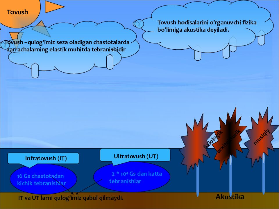 Tovush –qulog’imiz seza oladigan chastotalarda zarrachalarning elastik muhitda tebranishidir Tovush Akustika fiziologik arxitekturik musiqiy IT va UT larni qulog’imiz qabul qilmaydi. 16 Gs chastotadan kichik tebranishlar 2 * 10 4 Gs dan katta tebranishlar Tovush hodisalarini o’rganuvchi fizika bo’limiga akustika deyiladi. Infratovush (IT) Ultratovush (UT)