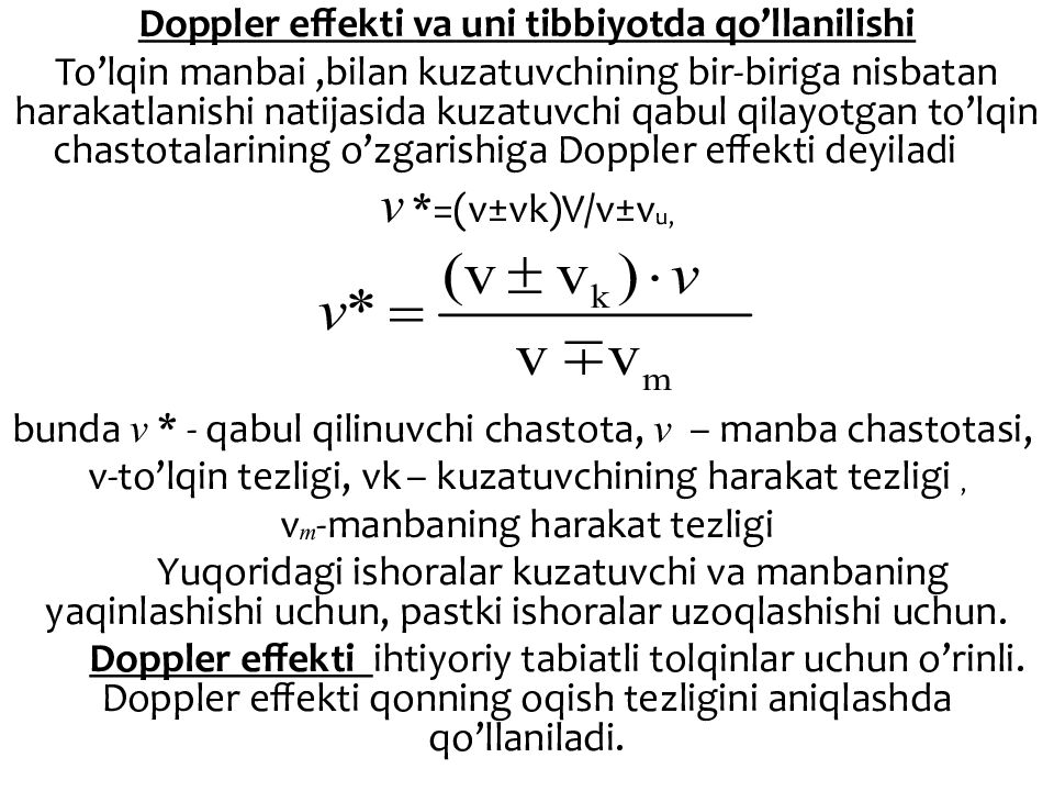 Doppler effekti va uni tibbiyotda qo’llanilishi To’lqin manbai, bilan kuzatuvchining bir-biriga nisbatan harakatlanishi natijasida kuzatuvchi qabul qilayotgan to’lqin chastotalarining o’zgarishiga Doppler effekti deyiladi v *=( v ±vk )V/ v ±v u, bunda v * - qabul qilinuvchi chastota, v – manba chastotasi, v - to’lqin tezligi, vk – kuzatuvchining harakat tezligi, v m - manbaning harakat tezligi Yuqoridagi ishoralar kuzatuvchi va manbaning yaqinlashishi uchun, pastki ishoralar uzoqlashishi uchun. Doppler effekti ihtiyoriy tabiatli tolqinlar uchun o’rinli. Doppler effekti qonning oqish tezligini aniqlashda qo’llaniladi.