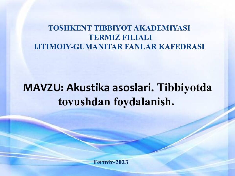 Первый слайд презентации: MAVZU : Akustika asoslari. Tibbiyotda tovushdan foydalanish