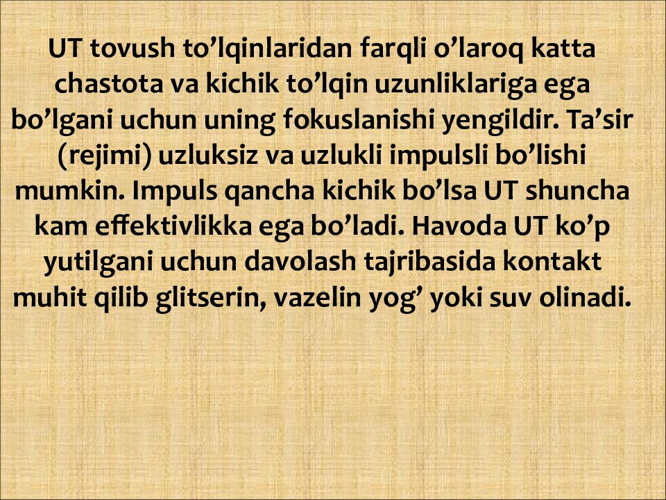 UT tovush to’lqinlaridan farqli o’laroq katta chastota va kichik to’lqin uzunliklariga ega bo’lgani uchun uning fokuslanishi yengildir. Ta’sir ( rejimi ) uzluksiz va uzlukli impulsli bo’lishi mumkin. Impuls qancha kichik bo’lsa UT shuncha kam effektivlikka ega bo’ladi. Havoda UT ko’p yutilgani uchun davolash tajribasida kontakt muhit qilib glitserin, vazelin yog ’ yoki suv olinadi.