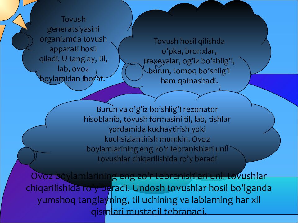 Tovush generatsiyasini organizmda tovush apparati hosil qiladi. U tanglay, til, lab, ovoz boylamidan iborat. Tovush hosil qilishda o’pka, bronxlar, traxeyalar, og’iz bo’shlig’I, burun, tomoq bo’shlig’I ham qatnashadi. Burun va o’g’iz bo’shlig’I rezonator hisoblanib, tovush formasini til, lab, tishlar yordamida kuchaytirish yoki kuchsizlantirish mumkin. Ovoz boylamlarining eng zo’r tebranishlari unli tovushlar chiqarilishida ro’y beradi Ovoz boylamlarining eng zo’r tebranishlari unli tovushlar chiqarilishida ro’y beradi. Undosh tovushlar hosil bo’lganda yumshoq tanglayning, til uchining va lablarning har xil qismlari mustaqil tebranadi.