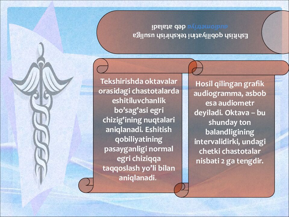 Eshitish qobiliyatini tekshirish usuliga audiometriya deb ataladi Tekshirishda oktavalar orasidagi chastotalarda eshitiluvchanlik bo’sag’asi egri chizig’ining nuqtalari aniqlanadi. Eshitish qobiliyatining pasayganligi normal egri chiziqqa taqqoslash yo’li bilan aniqlanadi. Hosil qilingan grafik audiogramma, asbob esa audiometr deyiladi. Oktava – bu shunday ton balandligining intervalidirki, undagi chetki chastotalar nisbati 2 ga tengdir.