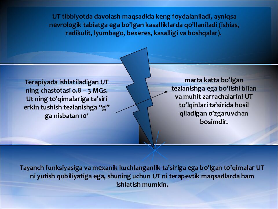 UT tibbiyotda davolash maqsadida keng foydalaniladi, ayniqsa nevrologik tabiatga ega bo’lgan kasalliklarda qo’llaniladi (ishias, radikulit, lyumbago, bexeres, kasalligi va boshqalar). Terapiyada ishlatiladigan UT ning chastotasi 0.8 – 3 MGs. Ut ning to’qimalariga ta’siri erkin tushish tezlanishga “g” ga nisbatan 10 5 marta katta bo’lgan tezlanishga ega bo’lishi bilan va muhit zarrachalarini UT to’lqinlari ta’sirida hosil qiladigan o’zgaruvchan bosimdir. Tayanch funksiyasiga va mexanik kuchlanganlik ta’siriga ega bo’lgan to’qimalar UT ni yutish qobiliyatiga ega, shuning uchun UT ni terapevtik maqsadlarda ham ishlatish mumkin.