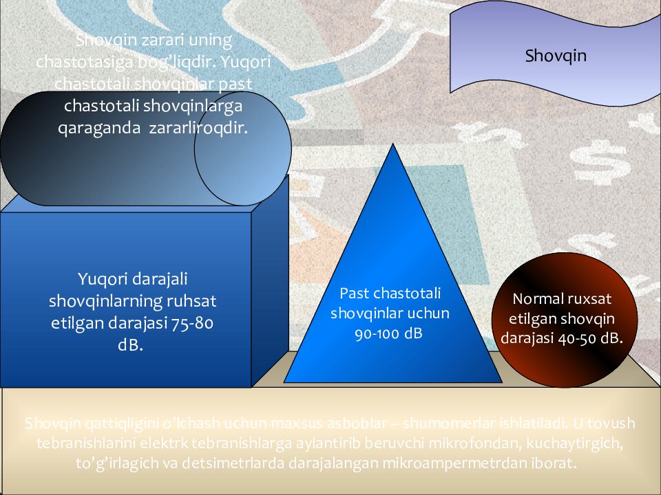 Shovqin Shovqin zarari uning chastotasiga bog’liqdir. Yuqori chastotali shovqinlar past chastotali shovqinlarga qaraganda zararliroqdir. Yuqori darajali shovqinlarning ruhsat etilgan darajasi 75-80 dB. Normal ruxsat etilgan shovqin darajasi 40-50 dB. Past chastotali shovqinlar uchun 90-100 dB Shovqin qattiqligini o’lchash uchun maxsus asboblar – shumomerlar ishlatiladi. U tovush tebranishlarini elektrk tebranishlarga aylantirib beruvchi mikrofondan, kuchaytirgich, to’g’irlagich va detsimetrlarda darajalangan mikroampermetrdan iborat.