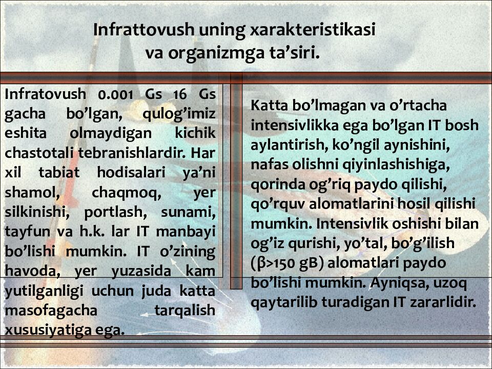 Infrattovush uning xarakteristikasi va organizmga ta’siri. Infratovush 0.001 Gs 16 Gs gacha bo’lgan, qulog’imiz eshita olmaydigan kichik chastotali tebranishlardir. Har xil tabiat hodisalari ya’ni shamol, chaqmoq, yer silkinishi, portlash, sunami, tayfun va h.k. lar IT manbayi bo’lishi mumkin. IT o’zining havoda, yer yuzasida kam yutilganligi uchun juda katta masofagacha tarqalish xususiyatiga ega. Katta bo’lmagan va o’rtacha intensivlikka ega bo’lgan IT bosh aylantirish, ko’ngil aynishini, nafas olishni qiyinlashishiga, qorinda og’riq paydo qilishi, qo’rquv alomatlarini hosil qilishi mumkin. Intensivlik oshishi bilan og’iz qurishi, yo’tal, bo’g’ilish ( β >150 gB ) alomatlari paydo bo’lishi mumkin. Ayniqsa, uzoq qaytarilib turadigan IT zararlidir.