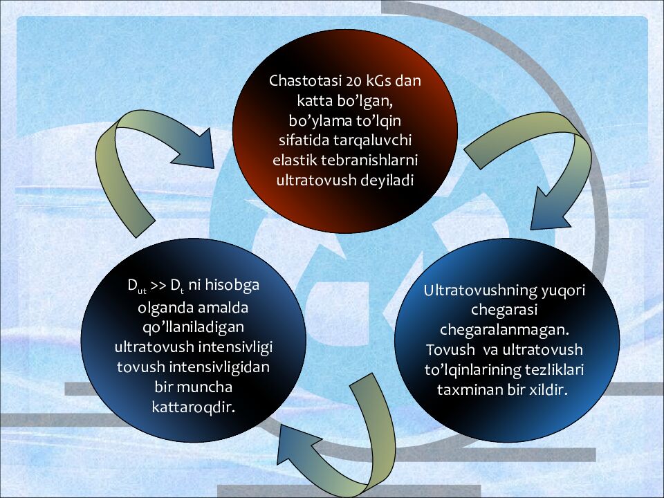 Chastotasi 20 kGs dan katta bo’lgan, bo’ylama to’lqin sifatida tarqaluvchi elastik tebranishlarni ultratovush deyiladi D ut >> D t ni hisobga olganda amalda qo’llaniladigan ultratovush intensivligi tovush intensivligidan bir muncha kattaroqdir. Ultratovushning yuqori chegarasi chegaralanmagan. Tovush va ultratovush to’lqinlarining tezliklari taxminan bir xildir.