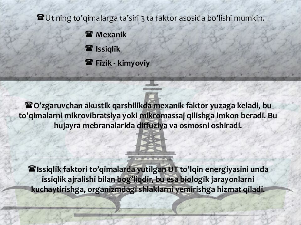 Ut ning to’qimalarga ta’siri 3 ta faktor asosida bo’lishi mumkin. O’zgaruvchan akustik qarshilikda mexanik faktor yuzaga keladi, bu to’qimalarni mikrovibratsiya yoki mikromassaj qilishga imkon beradi. Bu hujayra mebranalarida diffuziya va osmosni oshiradi. Mexanik Issiqlik Fizik - kimyoviy Issiqlik faktori to’qimalarda yutilgan UT to’lqin energiyasini unda issiqlik ajralishi bilan bog’liqdir, bu esa biologik jarayonlarni kuchaytirishga, organizmdagi shlaklarni yemirishga hizmat qiladi.