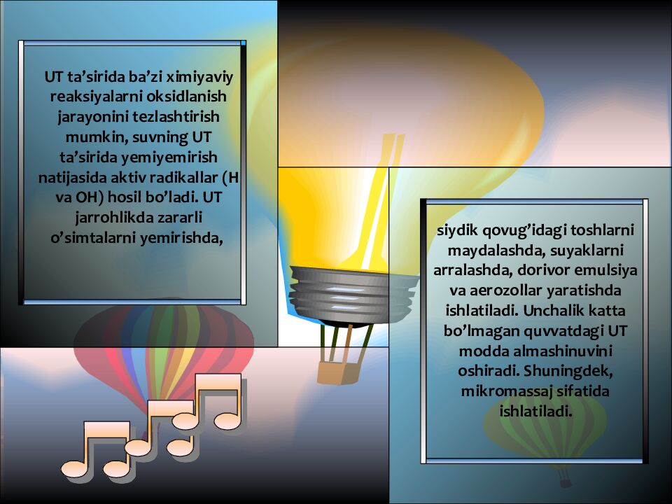 UT ta’sirida ba’zi ximiyaviy reaksiyalarni oksidlanish jarayonini tezlashtirish mumkin, suvning UT ta’sirida yemiyemirish natijasida aktiv radikallar (H va OH) hosil bo’ladi. UT jarrohlikda zararli o’simtalarni yemirishda, siydik qovug’idagi toshlarni maydalashda, suyaklarni arralashda, dorivor emulsiya va aerozollar yaratishda ishlatiladi. Unchalik katta bo’lmagan quvvatdagi UT modda almashinuvini oshiradi. Shuningdek, mikromassaj sifatida ishlatiladi.