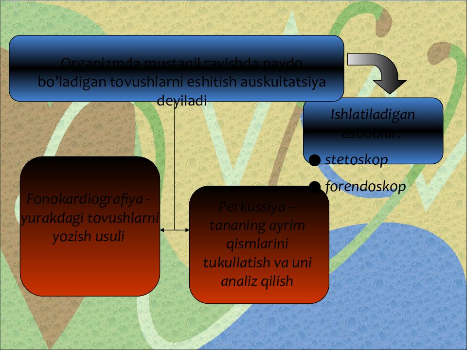 Fonokardiografiya - yurakdagi tovushlarni yozish usuli Perkussiya – tananing ayrim qismlarini tukullatish va uni analiz qilish Organizmda mustaqil ravishda paydo bo’ladigan tovushlarni eshitish auskultatsiya deyiladi Ishlatiladigan asboblar: ● stetoskop ● forendoskop