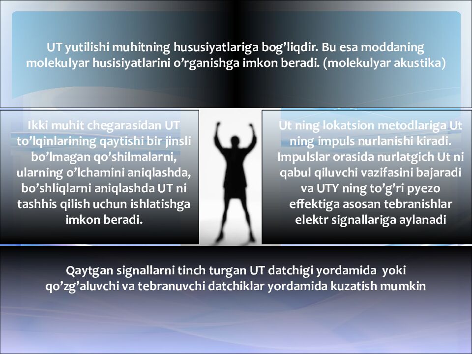 UT yutilishi muhitning hususiyatlariga bog’liqdir. Bu esa moddaning molekulyar husisiyatlarini o’rganishga imkon beradi. (molekulyar akustika) Ikki muhit chegarasidan UT to’lqinlarining qaytishi bir jinsli bo’lmagan qo’shilmalarni, ularning o’lchamini aniqlashda, bo’shliqlarni aniqlashda UT ni tashhis qilish uchun ishlatishga imkon beradi. Ut ning lokatsion metodlariga Ut ning impuls nurlanishi kiradi. Impulslar orasida nurlatgich Ut ni qabul qiluvchi vazifasini bajaradi va UTY ning to’g’ri pyezo effektiga asosan tebranishlar elektr signallariga aylanadi Qaytgan signallarni tinch turgan UT datchigi yordamida yoki qo’zg’aluvchi va tebranuvchi datchiklar yordamida kuzatish mumkin