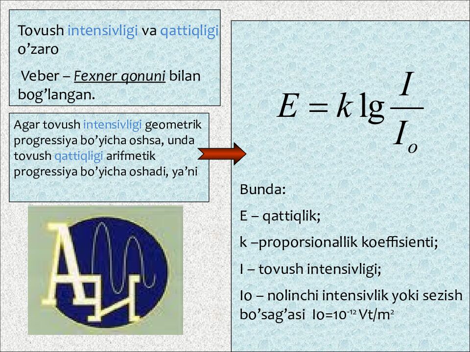 Tovush intensivligi va qattiqligi o’zaro Veber – Fexner qonuni bilan bog’langan. Agar tovush intensivligi geometrik progressiya bo’yicha oshsa, unda tovush qattiqligi arifmetik progressiya bo’yicha oshadi, ya’ni Bunda: E – qattiqlik; k –proporsionallik koeffisienti; I – tovush intensivligi; Io – nolinchi intensivlik yoki sezish bo’sag’asi Io=10 -12 Vt/m 2