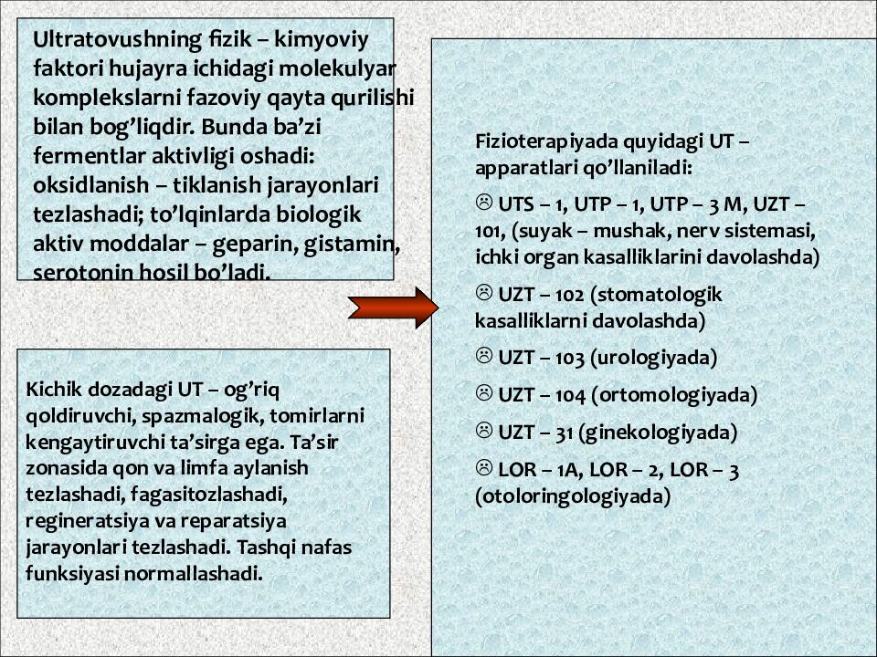 Ultratovushning fizik – kimyoviy faktori hujayra ichidagi molekulyar komplekslarni fazoviy qayta qurilishi bilan bog’liqdir. Bunda ba’zi fermentlar aktivligi oshadi : oksidlanish – tiklanish jarayonlari tezlashadi ; to’lqinlarda biologik aktiv moddalar – geparin, gistamin, serotonin hosil bo’ladi. Kichik dozadagi UT – og’riq qoldiruvchi, spazmalogik, tomirlarni kengaytiruvchi ta’sirga ega. Ta’sir zonasida qon va limfa aylanish tezlashadi, fagasitozlashadi, regineratsiya va reparatsiya jarayonlari tezlashadi. Tashqi nafas funksiyasi normallashadi. Fizioterapiyada quyidagi UT – apparatlari qo’llaniladi : UTS – 1, UTP – 1, UTP – 3 M, UZT – 101, ( suyak – mushak, nerv sistemasi, ichki organ kasalliklarini davolashda ) UZT – 102 ( stomatologik kasalliklarni davolashda ) UZT – 103 ( urologiyada ) UZT – 104 ( ortomologiyada ) UZT – 31 ( ginekologiyada ) LOR – 1A, LOR – 2, LOR – 3 ( otoloringologiyada )