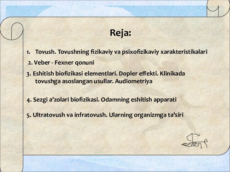 Reja : Tovush. Tovushning fizikaviy va psixofizikaviy xarakteristikalari 2. Veber - Fexner qonuni 3. Eshitish biofizikasi elementlari. Dopler effekti. Klinikada tovushga asoslangan usullar. Audiometriya 4. Sezgi a’zolari biofizikasi. Odamning eshitish apparati 5. Ultratovush va infratovush. Ularning organizmga ta’siri