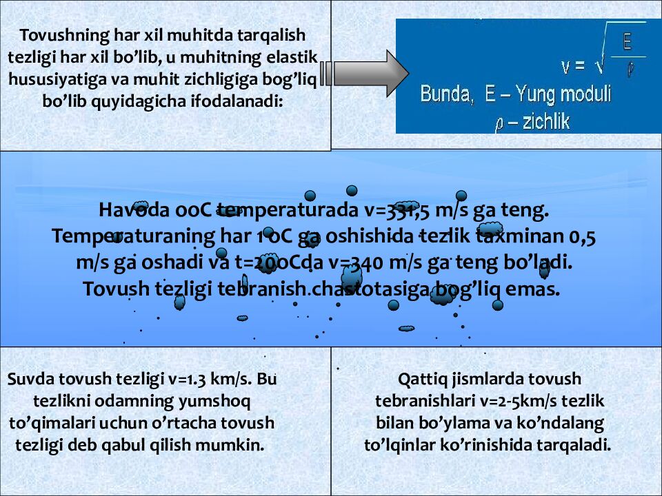 Tovushning har xil muhitda tarqalish tezligi har xil bo’lib, u muhitning elastik hususiyatiga va muhit zichligiga bog’liq bo’lib quyidagicha ifodalanadi: Suvda tovush tezligi v=1.3 km/s. Bu tezlikni odamning yumshoq to’qimalari uchun o’rtacha tovush tezligi deb qabul qilish mumkin. Qattiq jismlarda tovush tebranishlari v=2-5km/s tezlik bilan bo’ylama va ko’ndalang to’lqinlar ko’rinishida tarqaladi. Havoda ooC temperaturada v=33 1,5 m/s ga teng. Temperaturaning har 1 oC ga oshishida tezlik taxminan 0,5 m/s ga oshadi va t=20oCda v=340 m/s ga teng bo’ladi. Tovush tezligi tebranish chastotasiga bog’liq emas.