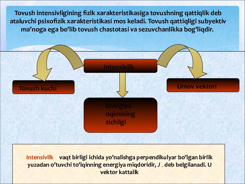 Tovush intensivligining fizik xarakteristikasiga tovushning qattiqlik deb ataluvchi psixofizik xarakteristikasi mos keladi. Tovush qattiqligi subyektiv ma’noga ega bo’lib tovush chastotasi va sezuvchanlikka bog’liqdir. Intensivlik Tovush kuchi Umov vektori Energiya oqimining zichligi Intensivlik – vaqt birligi ichida yo’nalishga perpendikulyar bo’lgan birlik yuzadan o’tuvchi to’lqinning energiya miqdoridir, J deb belgilanadi. U vektor kattalik