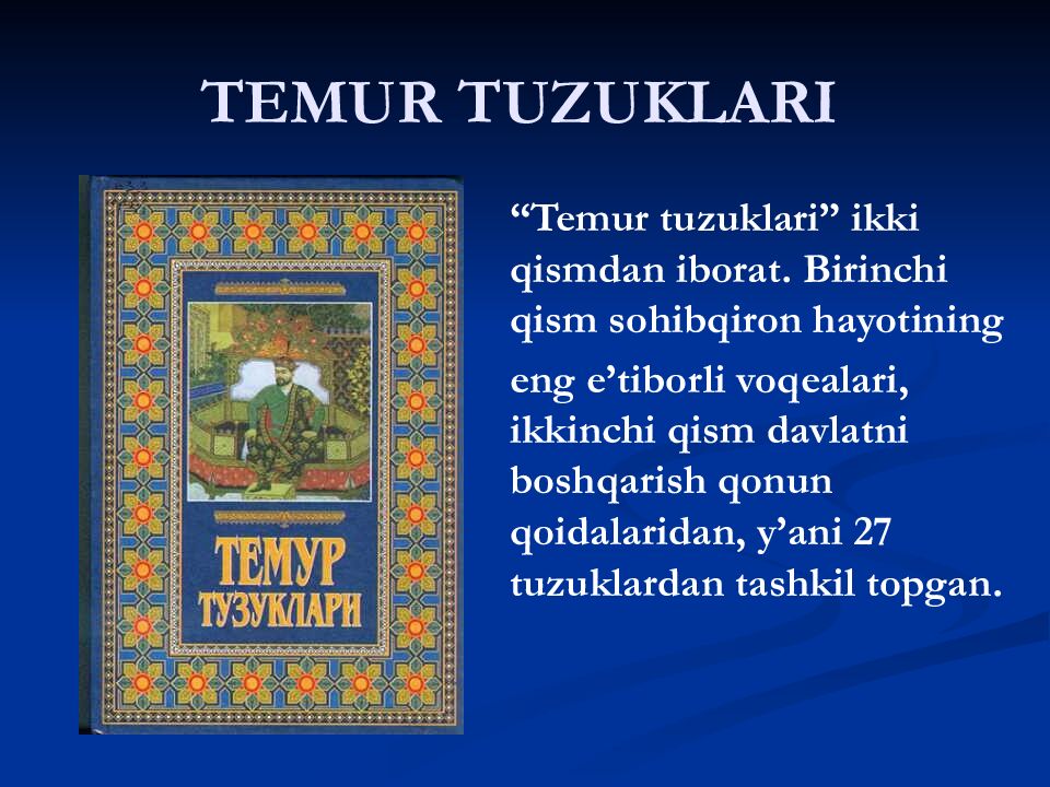 “Temur tuzuklari” ikki qismdan iborat. Birinchi qism sohibqiron hayotining eng e’tiborli voqealari, ikkinchi qism davlatni boshqarish qonun qoidalaridan, y’ani 27 tuzuklardan tashkil topgan.